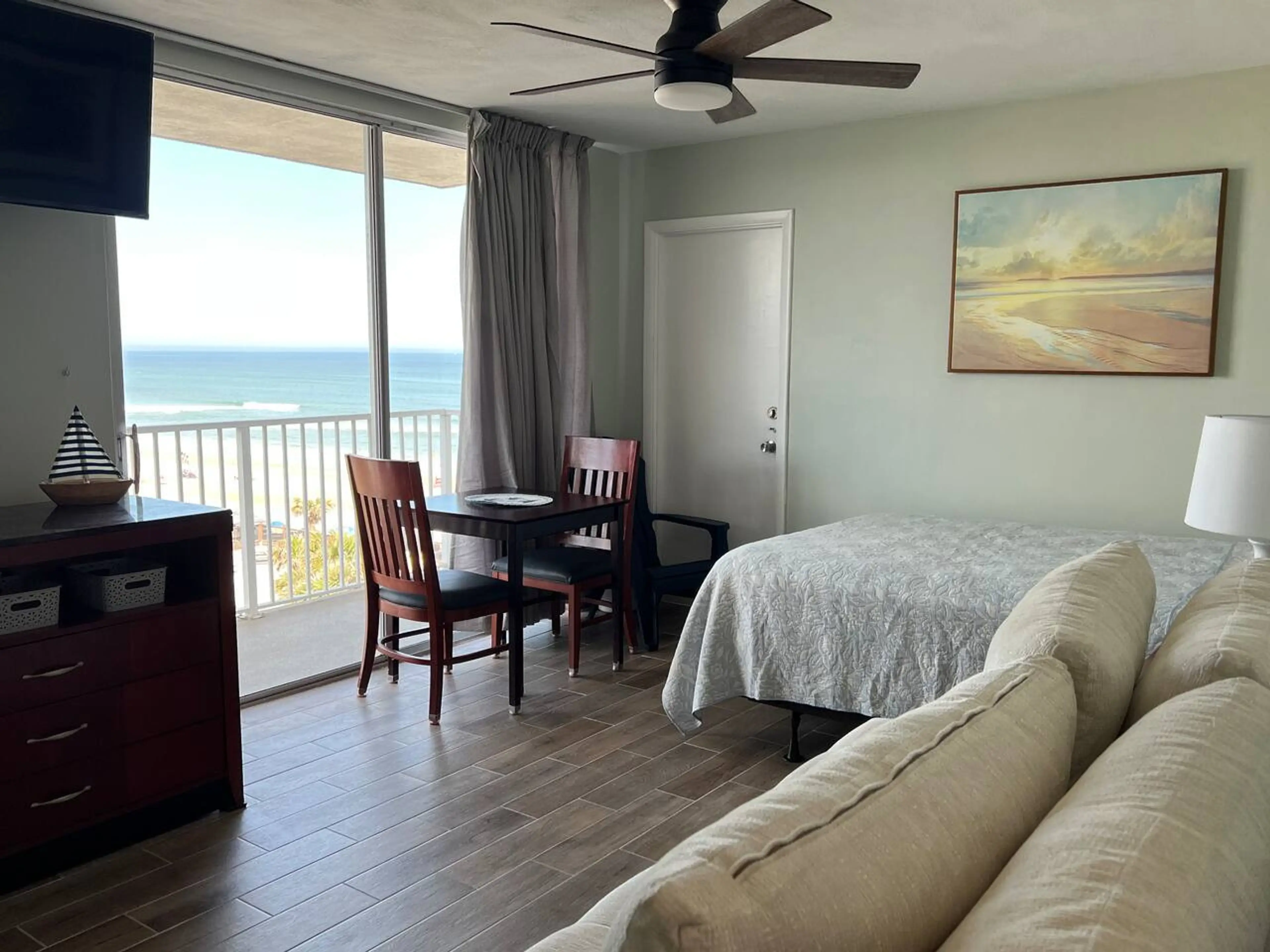 • ☀ Steps to the Sand: Direct access to Daytona Beach. • 🏊 Year-Round Swimming: Access to both Indoor & Outdoor pools. • ☕ Morning Coffee: Keurig station with stunning ocean views. • One parking spot included for your convenience Experience beachside bliss in our charming studio that comfortably s...